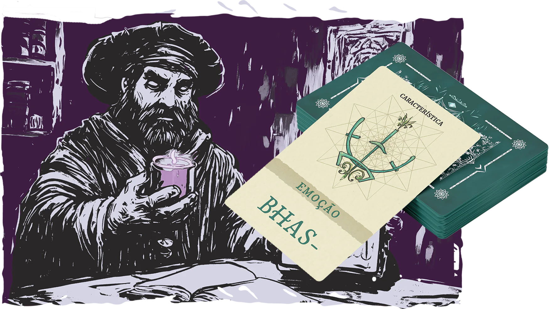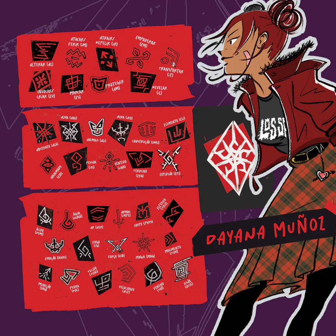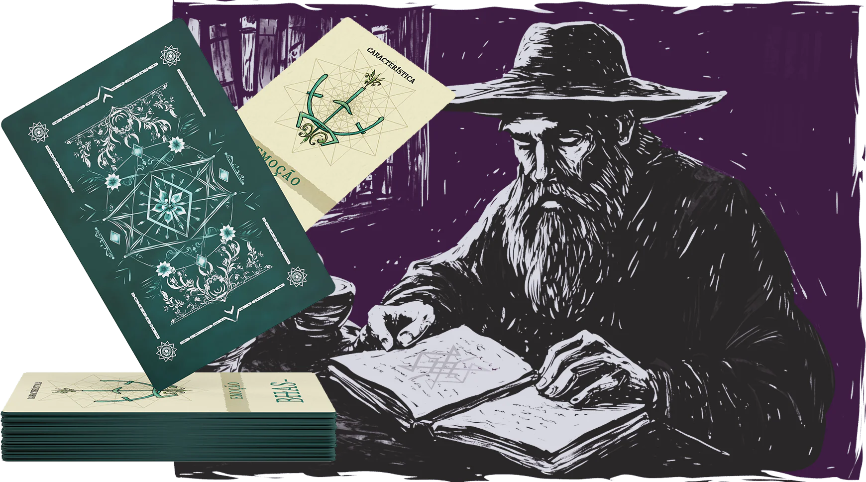 Para organizar suas Partículas neste jogo, sugerimos cartas: cada uma representando um aspecto da linguagem mágica, seu símbolo, nome e significado. É assim que você conjura, constrói e transforma — escolhendo suas palavras com criatividade, lógica e intenção.