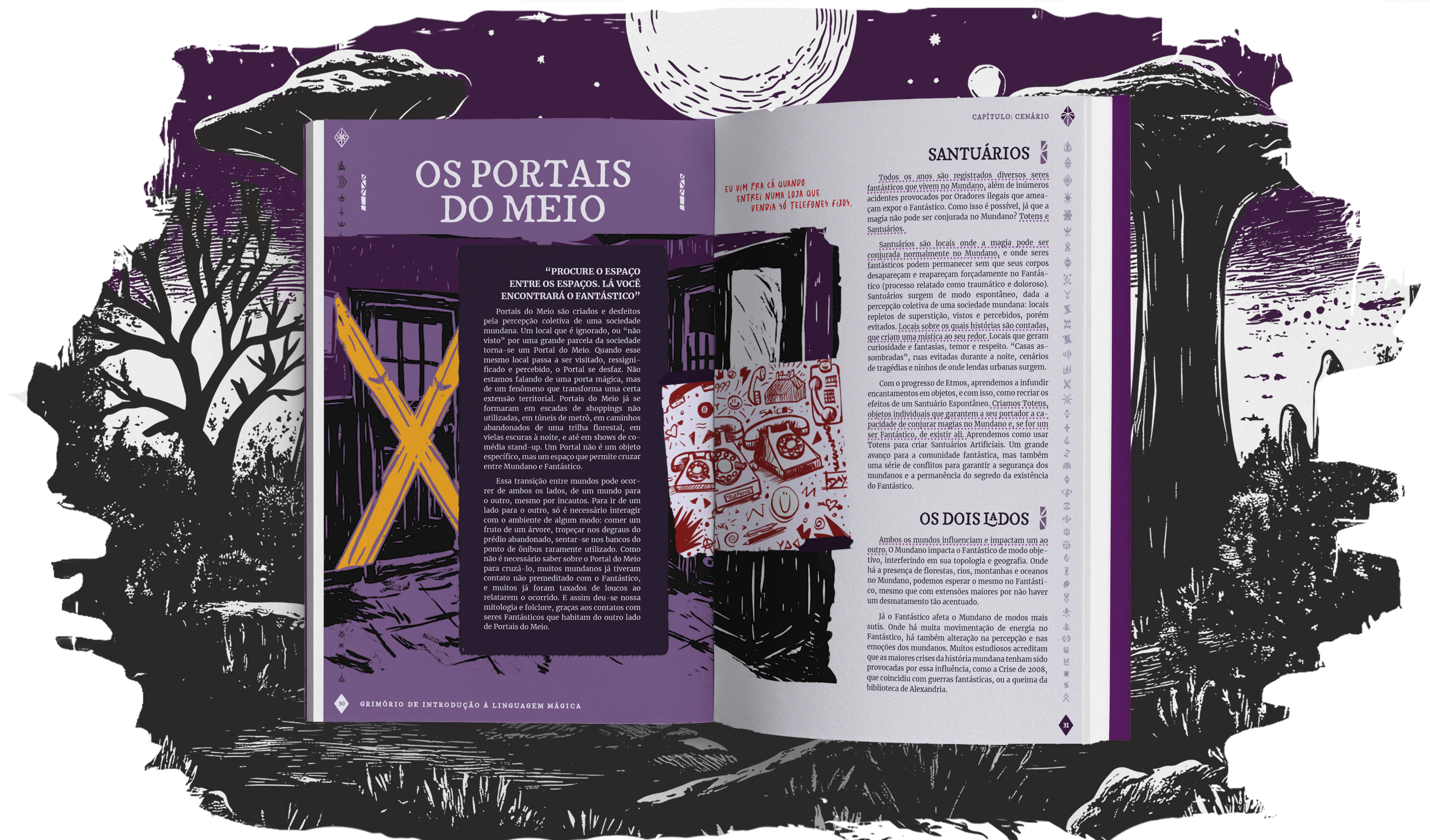 e o Fantástico, o humano e a magia. Ainda assim, foram os humanos que conectaram os mundos. Ao se organizarem em comunidades, com lendas e superstições, a força coletiva de suas mentes abriu acessos ao mundo Fantástico — os chamados Portais do Meio.